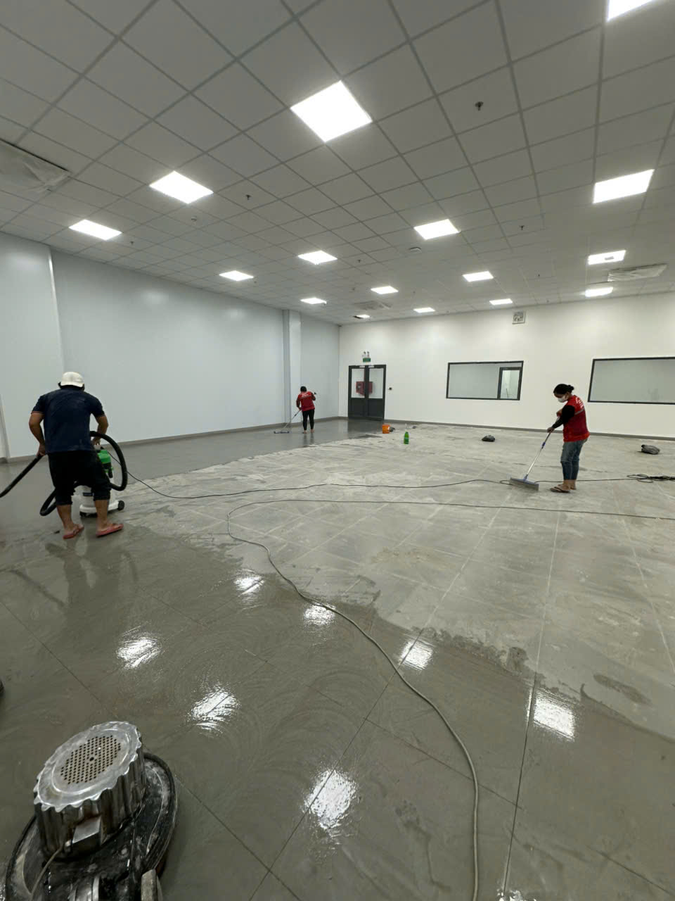 - Sàn Bê tông (Concrete): Quy trình mài và đánh bóng chuyên sâu (Polished Concrete) kèm theo hóa chất làm cứng Silicate để tạo độ bền và bóng vượt trội.